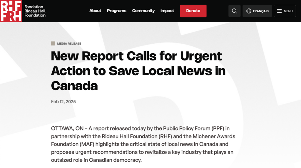 A report released on Feb. 12, 2025 highlights the critical state of local news in Canada and proposes urgent recommendations to revitalize a key industry that plays an outsized role in Canadian democracy.